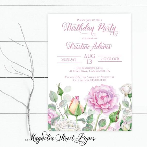 Watercolor Floral Birthday Invitation Pink And White Roses Invite Woman S Spring Garden Party Printable Or Printed By Magnolia Street Paper Catch My Party